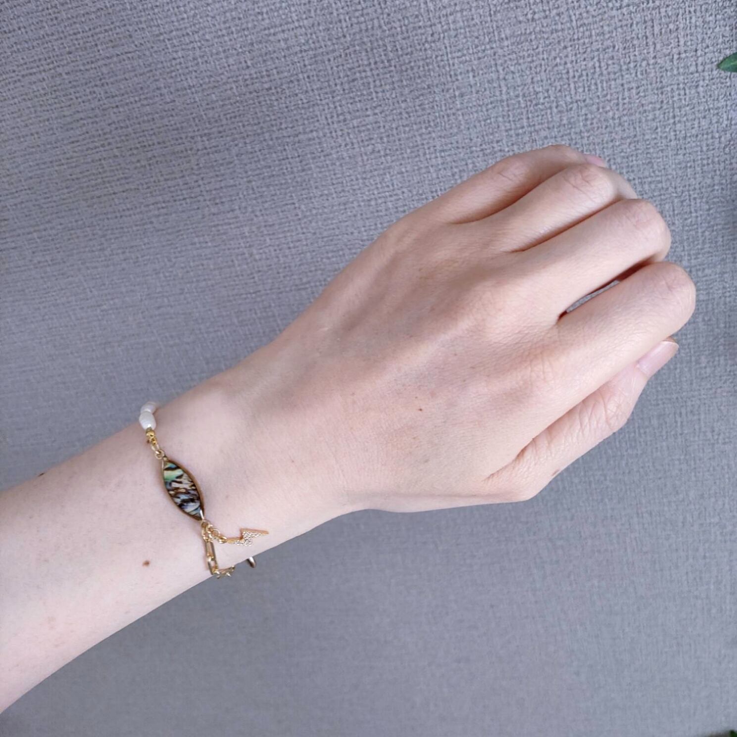マーキス型のアバロンシェルを使用したブレスレットで、雫型シェルも使用したタイプです。