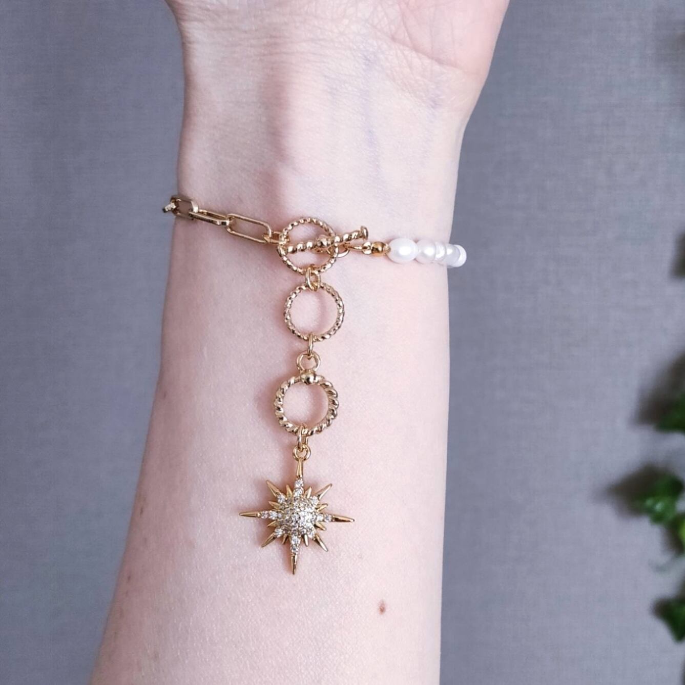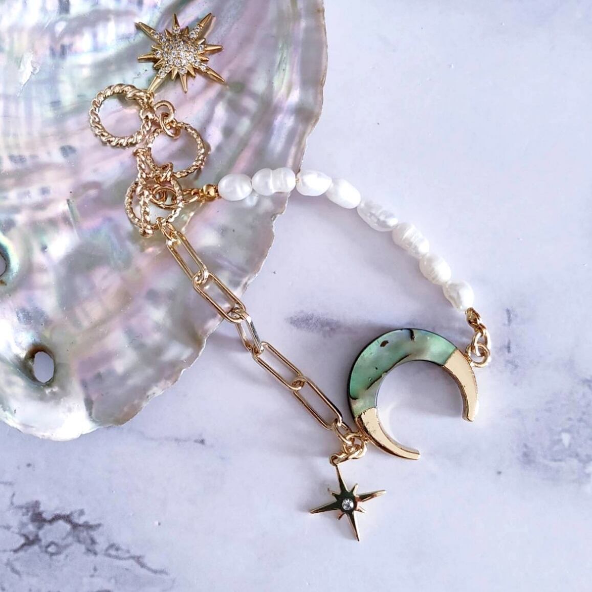 三日月型のアバロンシェルを使用したブレスレットで、シンプルチェーンを使用したタイプです。