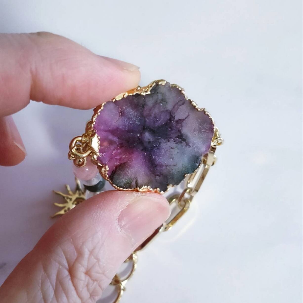 ソーラークォーツは瑪瑙と水晶の混合石で、こちらは虹色に染めています。
