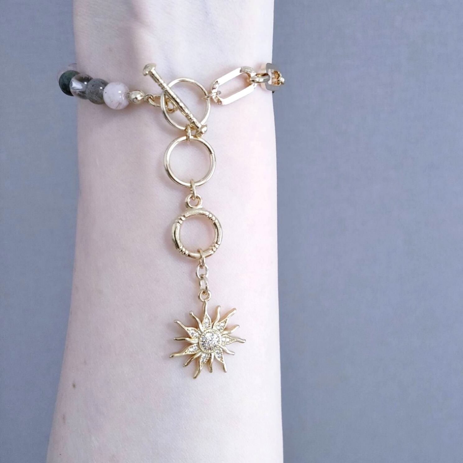 プラチナクォーツ、水晶、瑪瑙などの天然石ビーズを使用し、チェーンは太めのものを、そして太陽パーツ、クロスパーツも添えています。