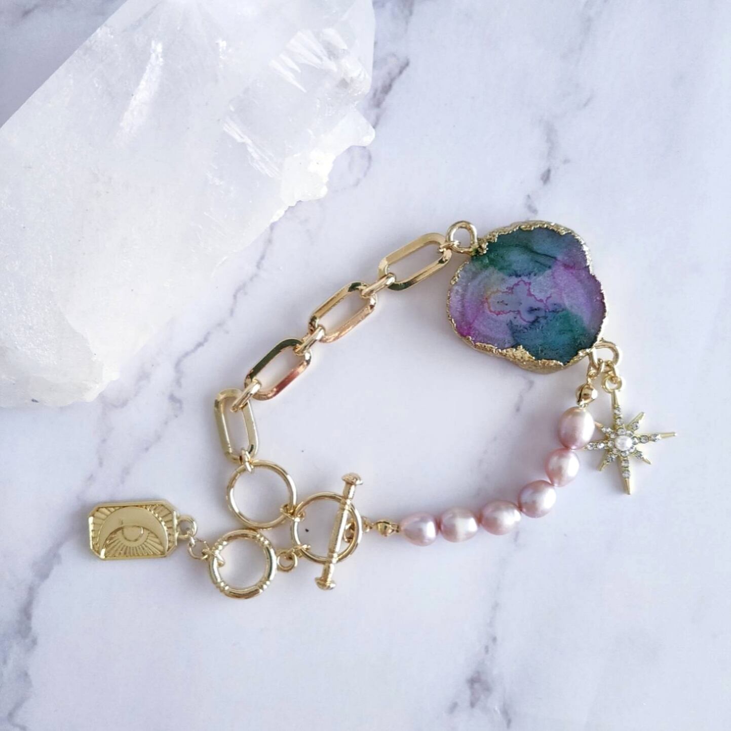 ソーラークォーツは瑪瑙と水晶の混合石で、こちらはパープルとグリーンに染めています。