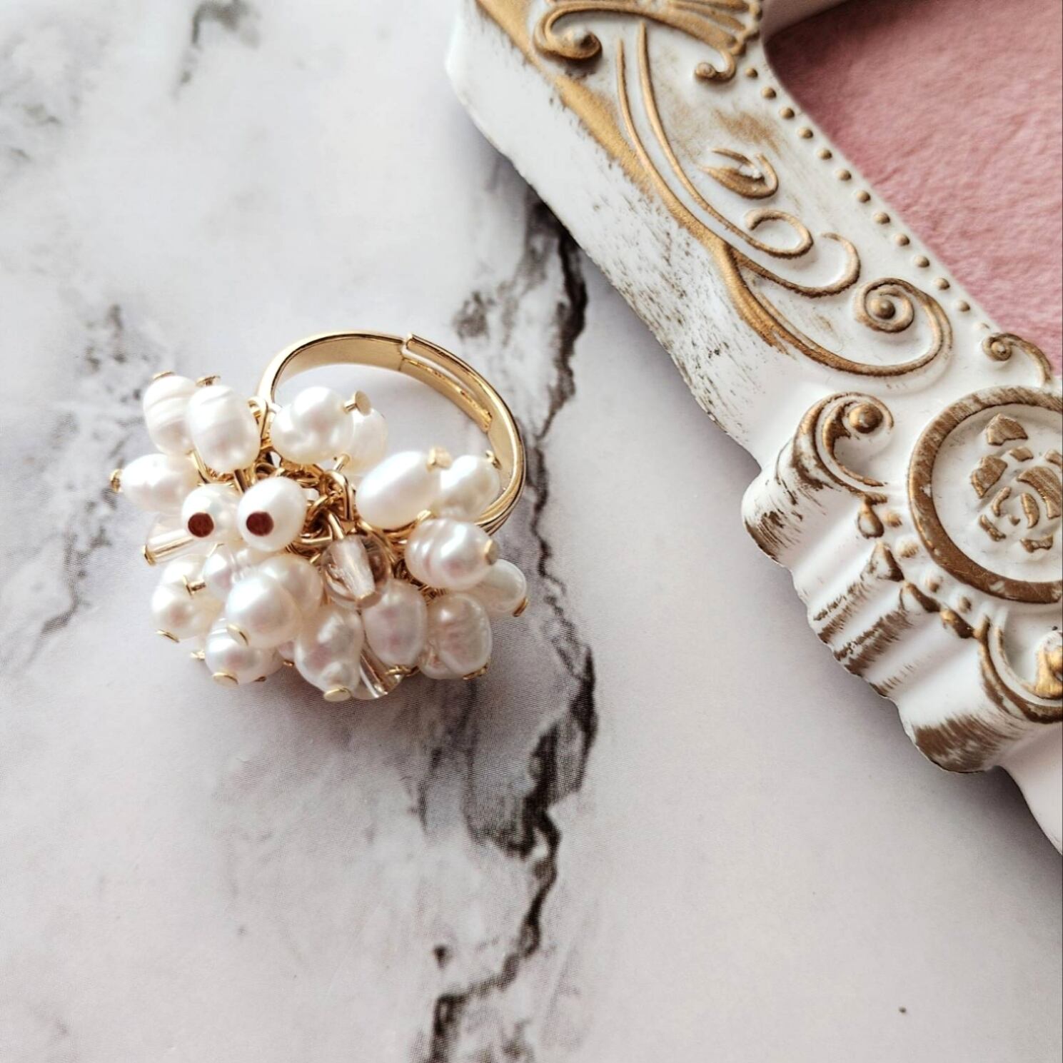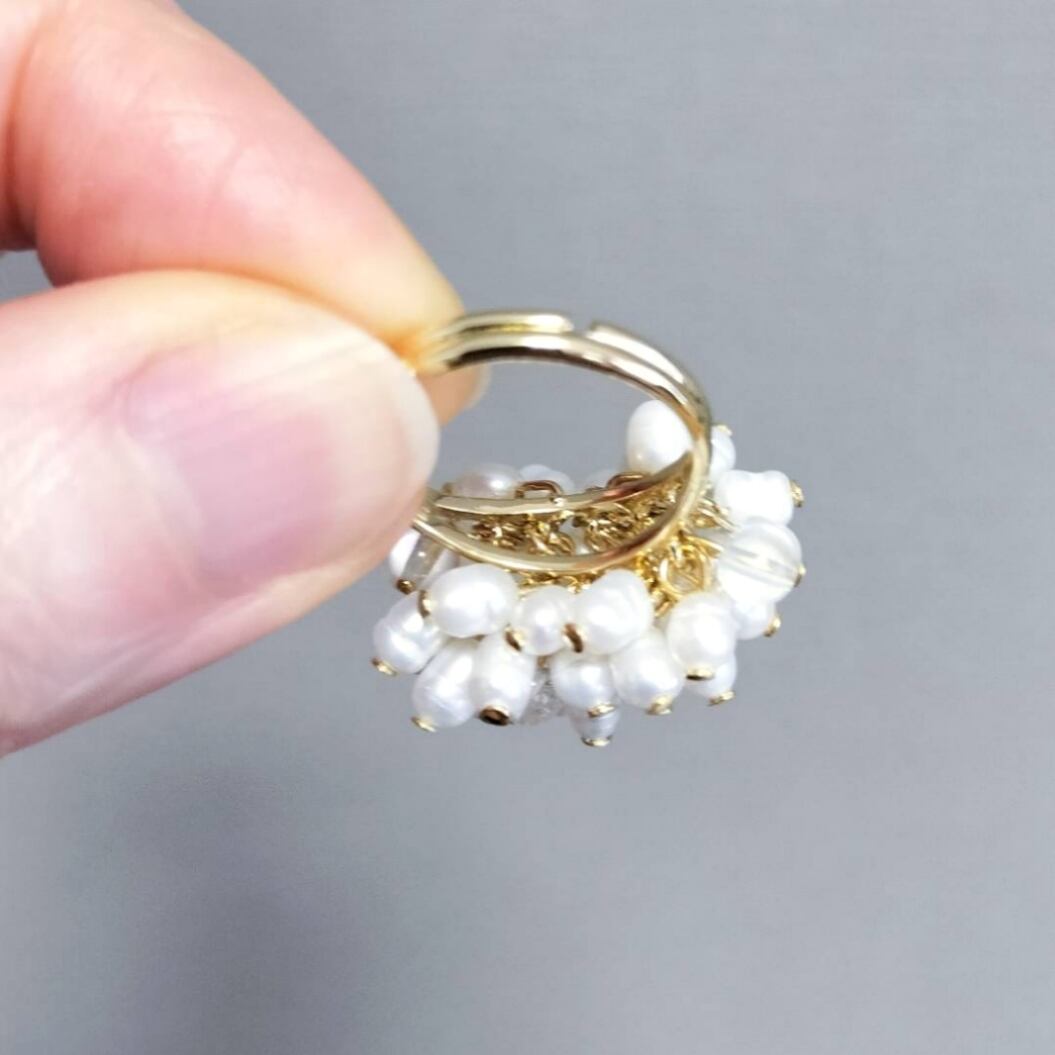 ミニサイズの淡水パールがシャワシャワ動くゴージャスなリングで、淡水パールの照りとクリアクォーツの煌きが華やかです✨
