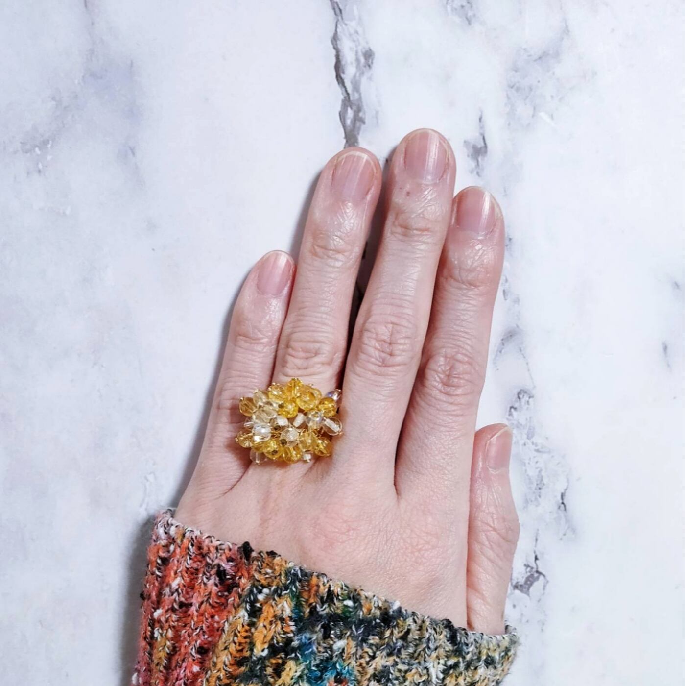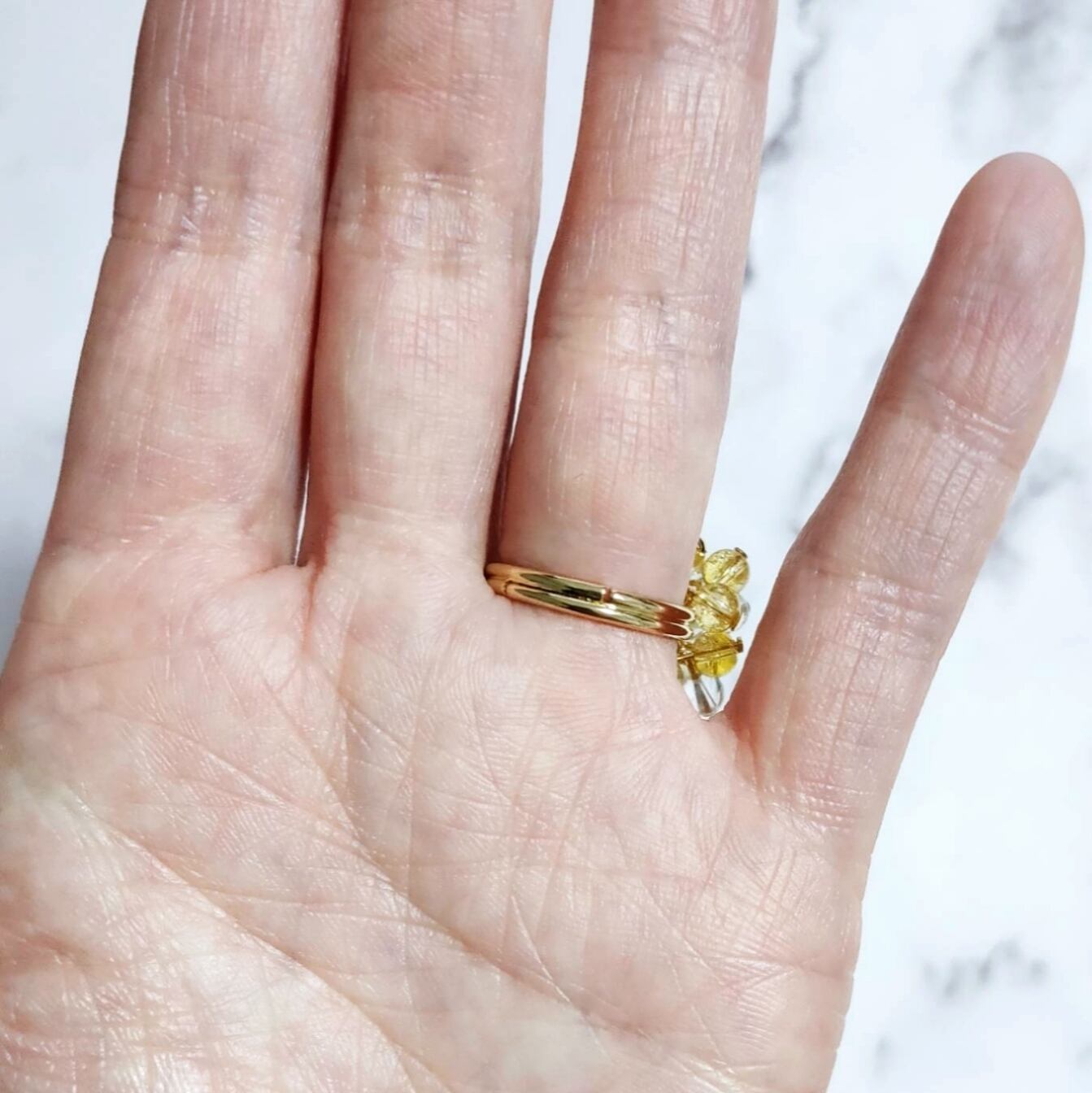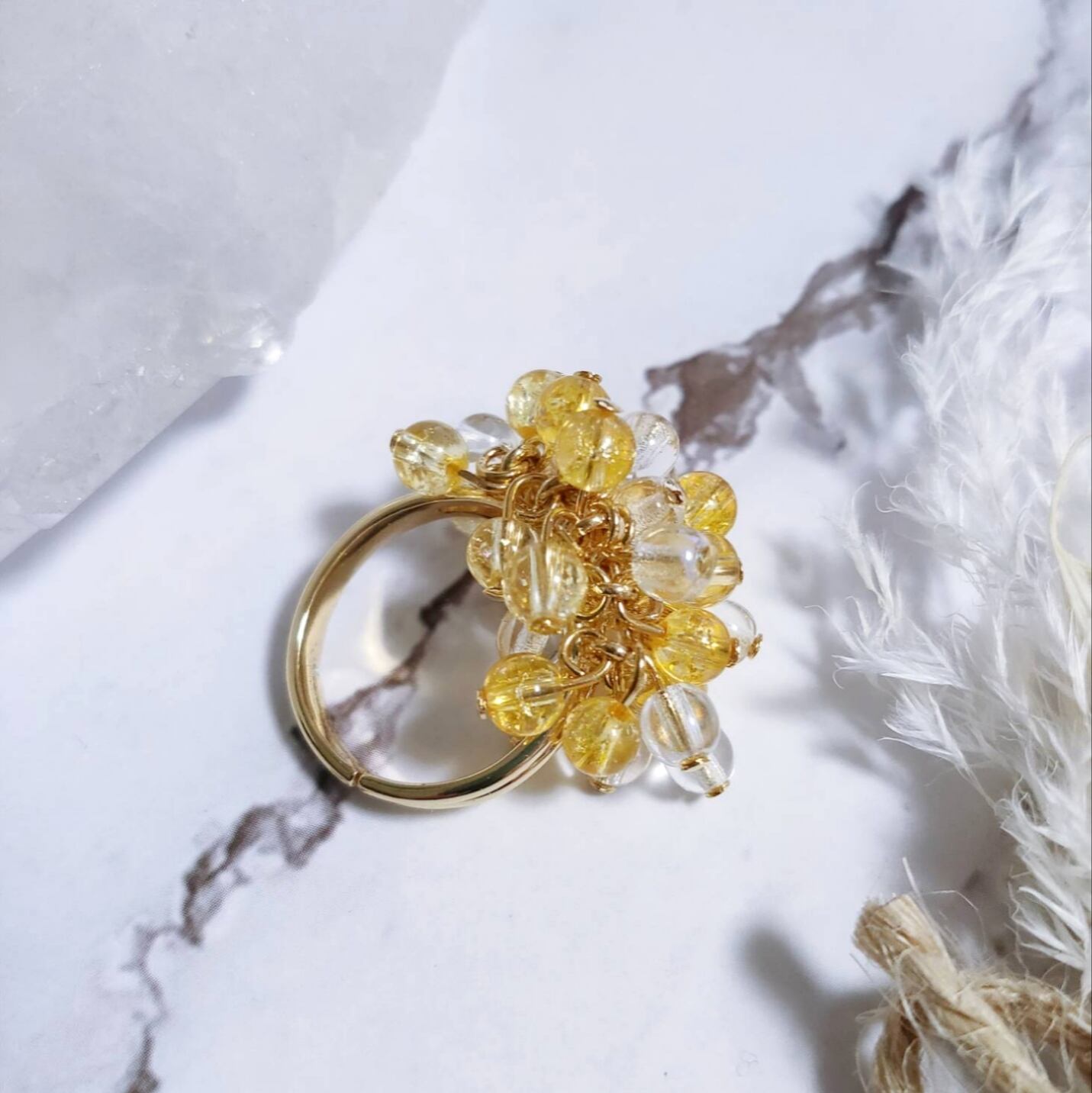 ミニサイズのシトリンとクリアクォーツがシャワシャワ動く、ボリュームたっぷりのゴージャスなリングで、きらびやかに光を反射します✨