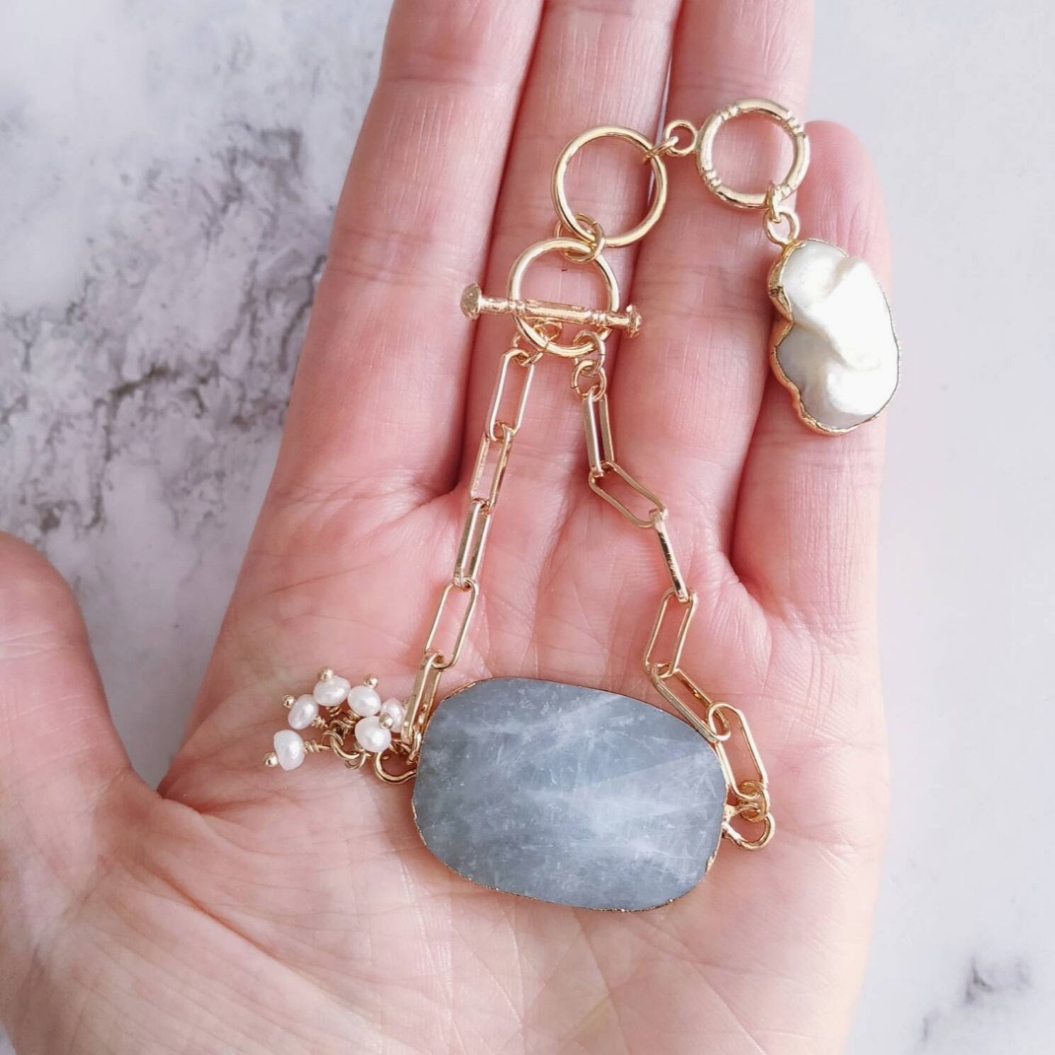 横から見ると中心部に盛り上がった大きめサイズのアクアマリンと自然が作り出した造形美であるケシパール、そして小粒な淡水パールを使用したブレスレットです。