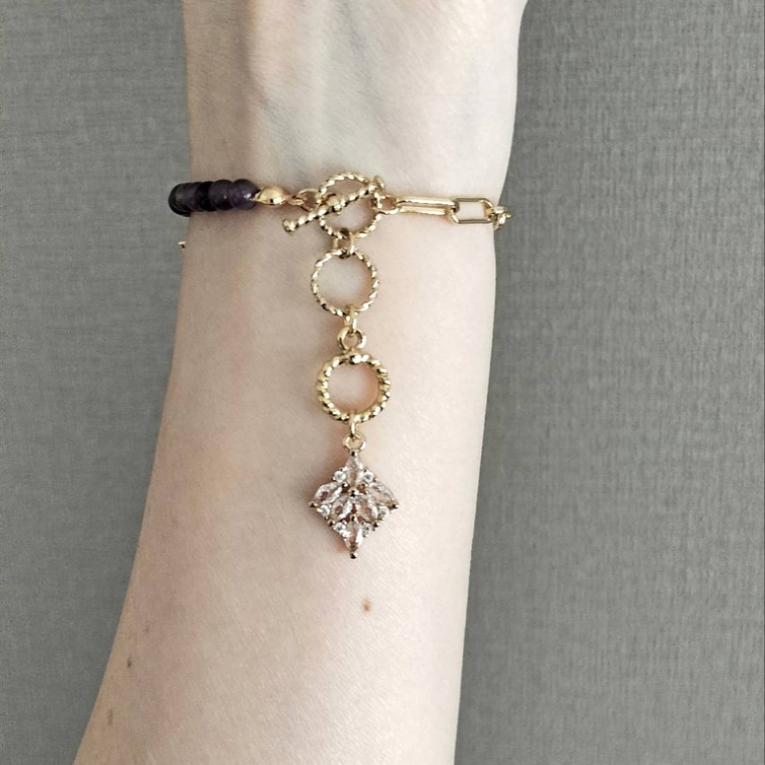 同じく小粒のアメジストビーズと蓮形とダイヤ形のキュービックジルコニアパーツを添えています。
